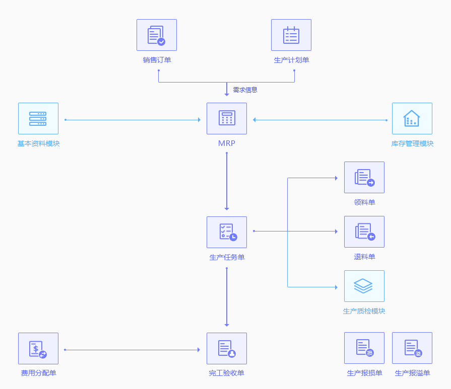 系统依据订单或计划单要求的时间、数量进行物料需求分析,自动产生材料采购计划和产品生产计划,指导企业进行物料采购,同时生产车间依据任务单进行材料的领退料,生产完工后进行入库,并通过人工及制造费用的分摊进行成本核算。支持替代料分析物料数量需求。(替代料支持T8&T9)