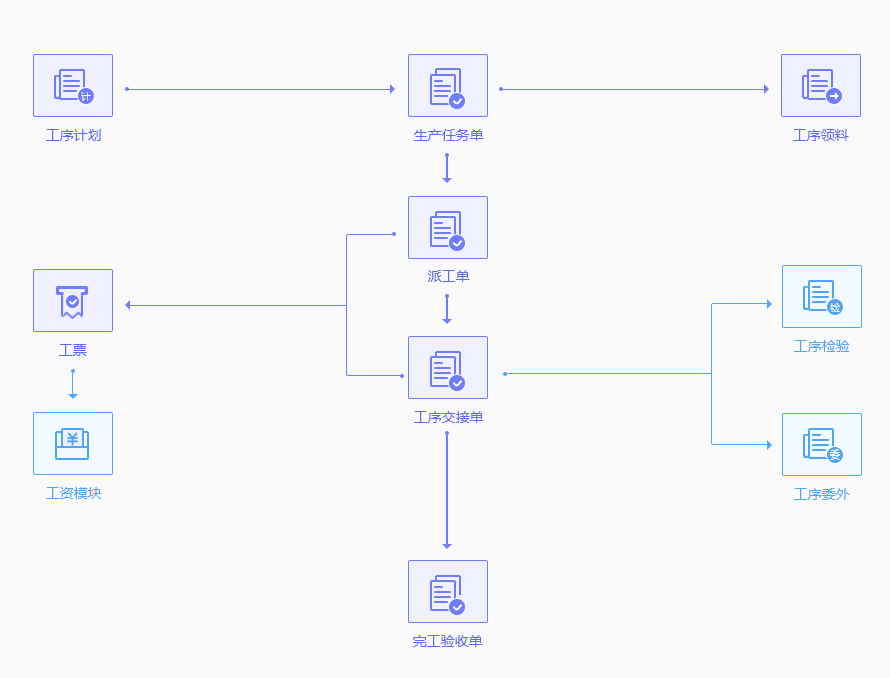 依据制订的工艺流程,将生产任务划分为多个生产单元(即工序),分别进行派工,每道工序严格按照工艺流程的先后顺序,完工后向下一道工序流转。通过工序流转单的统计,可以方便的记录生产任务的生产进度。